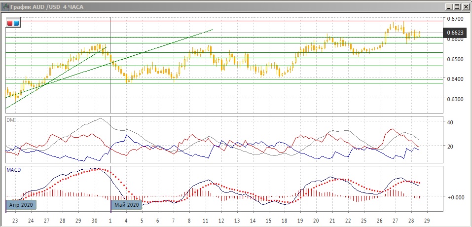 На четырёхчасовом графике при откате он остановился перед "круглым" уровнем 0,6600. Пара остаётся выше верхнего уровня диапазона в апреле, и пока она выше 0,6570, более вероятным видится продолжение роста. Верхние тени свечей при приближении к следующему "круглому" уровню на 0,6700 может предполагать период консолидации после относительно сильного роста от 0,6400.