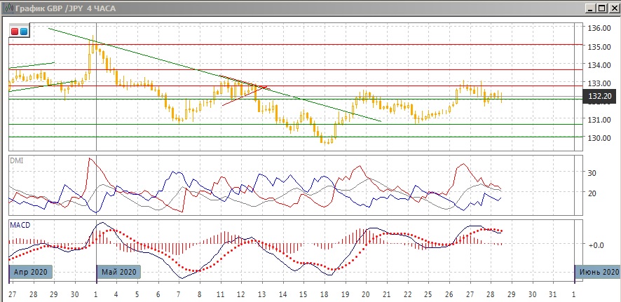 На четырёхчасовом графике тестирование важного уровня сопротивления 132,75 привело к откату, но пара получила поддержу на также важном уровне 132,75. Вероятно, дальнейшая краткосрочная перспектива будет зависеть от того, в какую сторону пары выйдет за пределы 132,00-132,75. Если выход будет вниз, целью виделся бы уровень поддержки 130,65. Если вверх, но следующее сильное сопротивление на 135,00.