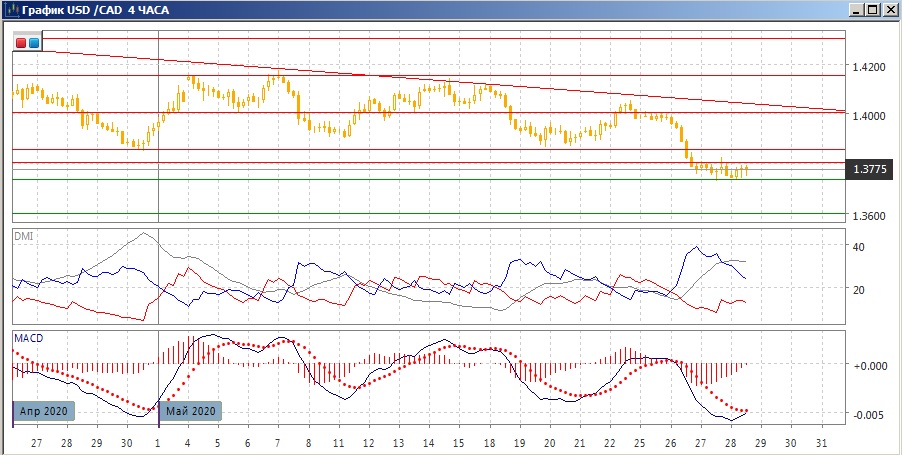 На четырёхчасовом графике пара после сильного снижения от 1,4000 находится в узкой консолидации 1,3740-1,3800. Тенденция снижения по ADX является сильной: превышение DM- над DM+ большое при высоком уровне ADX. Дальнейшая краткосрочная перспектива, вероятно, будет зависеть от направления выхода из текущей узкой консолидации 1,3740-1,3800. В целом продолжение снижения выглядит предпочтительно.