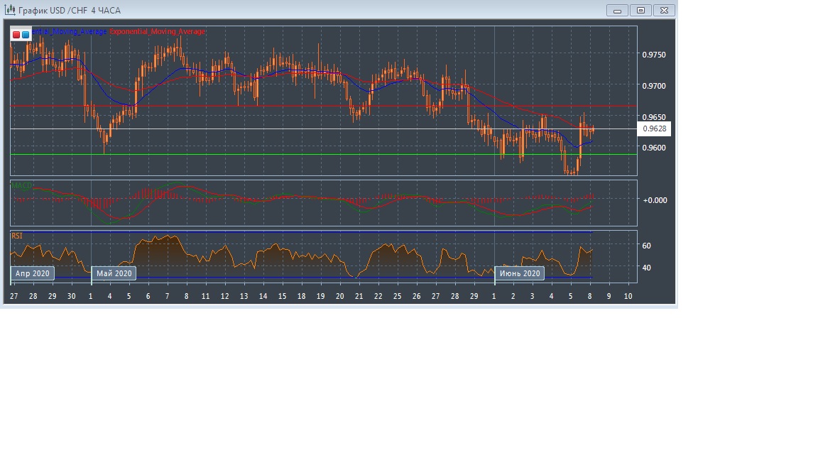 На четырёхчасовом графике скользящие средние с периодом 21 и 55 дней продолжают двигаться вниз, сохраняя расхождение, но замедлились. При этом график рынка развивается между экспоненциальных скользящих средних, что говорит о слабеющем медвежьем потенциале данного рынка в краткосрочной перспективе.