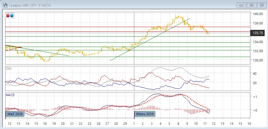 На дневном графике снижение продолжилось и пара преодолела поддержку на 137,00 и достигла уровня 136,00 - это близко к максимуму апреля. Более сильная поддержка на 135,00 - верхней границе канала конца марта - мая. По индикаторам направленного движения - коррекция к росту: сама тенденция роста остаётся сильно, по ADX превышение DM+ над DM- большое, ADX на высоком уровне. Линия MACD сохраняет положительный наклон. Гистограмма MACD снижается, но остаётся в положительной зоне. Сейчас, скорее, надо ожидать момента прекращения коррекции и возобновления роста пары. Зона 135-136 может оказаться базой для возобновления роста.