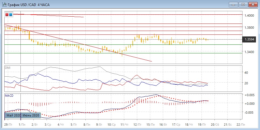 На четырёхчасовом графике пара остаётся в диапазоне 1,3500-1,3675, примерно в его середине. Так как после нахождения пары в нижней половине диапазона прорыв вниз не произошёл, в рамках движения в диапазоне пара может вырасти до верхней границы на 1,3675. По индикаторам направленного движения слабая тенденция роста: хотя гистограмма MACD около нуля и линия MACD горизонтальна, небольшое превышение DM+ над DM- остаётся устойчивым.