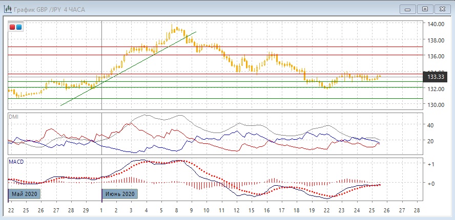 На четырёхчасовом графике пара находится в узком диапазоне 132,75-133,65. Исходя из движения в диапазоне, более вероятно возвращение к нижней границе, так как пара приблизилась к верхней границе, и она - сильный уровень сопротивления. Так как пара довольно долго остаётся в узкой консолидации, при выходе из неё возможно более существенно движение в направлении выхода. По индикаторам направленного движения флэт: DM+ и DM- близки, колебания гистограммы MACD около нулевого уровня не выходят за пределы предыдущих.