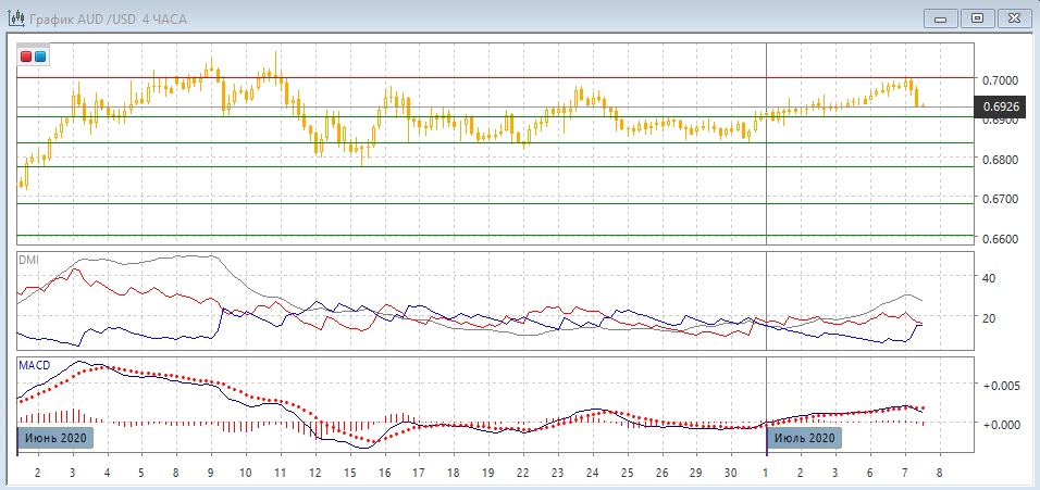 На четырёхчасовом графике пара резко снижается после медленного движения к 0,70, при котором этот психологически важный уровень был достигнут. Так как пара остаётся в диапазоне, и сопротивление на 0,7000 ещё раз подтвердилось, более вероятным сейчас кажется продолжение снижения. По ADX тенденций остаётся рост: DM+ выше DM- при относительно высоком уровне ADX. У 0,7000 образовалось медвежье расхождение максимумов пары и гистограммы MACD. Подтверждением разворотного сигнала может быть откат от важного уровня сопротивления.