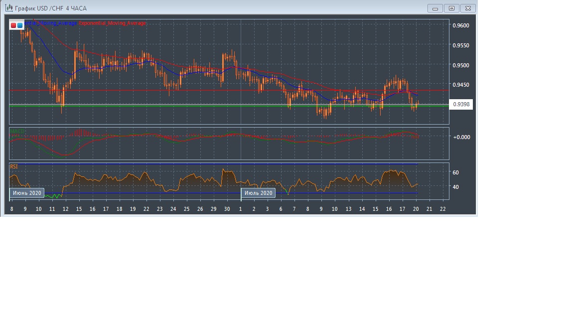 На четырёхчасовом графике скользящие средние с периодом 21 и 55 дней замедлились и развернулись вниз, сокращая расхождение. При этом график рынка развивается ниже экспоненциальных скользящих средних, что подтверждает медвежью тенденцию данного рынка в краткосрочной перспективе.