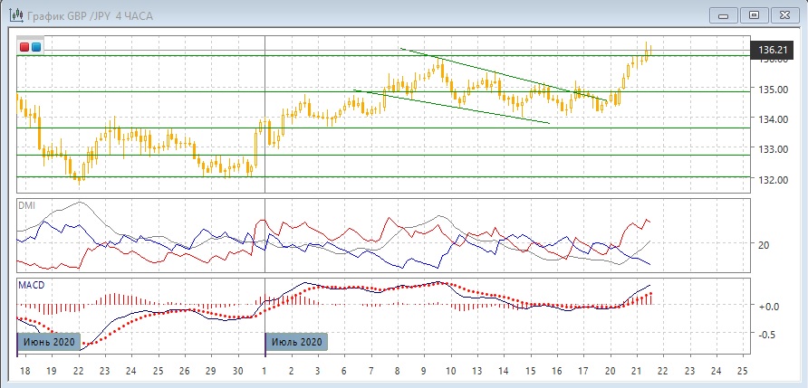 На дневном графике резко выросла после приближения к уровню 134,00, во вторник пара достигла более высокого относительного максимума, чем в начале июля. При закрытии выше 136 вблизи сопротивления будет уже не видно, до максимумов июня ниже 140. Образование относительно широкодиапазонной свечи в понедельник предполагает, что скорее всего в ближайшей перспективе импульс роста сохранится. По индикаторам направленного движения рост является слабой тенденцией: DM+ устойчиво выше DM-, хотя ADX на низком уровне, гистограмма MACD выросла выше нулевого уровня, линия MACD получила положительный наклон.