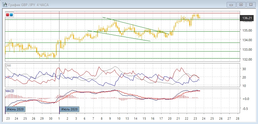 На дневном графике пара осталась выше уровня сопротивления 136,00 (и выше максимума начала июля). То, что пара остаётся выше уровня поддержки, предполагает возможность продолжения роста в перспективе к максимуму июня ниже 140,00. По индикаторам направленного движения рост остаётся слабой тенденцией: DM+ устойчиво выше DM-, хотя ADX остаётся на низком уровне, гистограмма MACD немного выше нулевого уровня, линия MACD сохраняет положительный наклон.