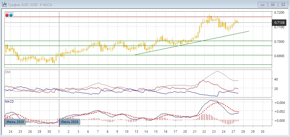 На четырёхчасовом графике откат с 22 июля больше частью был восстановлен. Пара удержалась выше ближайшего "круглого" уровня 0,7100. Если рассматривать откат с 22 июля как коррекцию к росту, то размер восстановления предполагает, что пара, скорее, вернётся к исходному уровню коррекции (сопротивление на 0,7165). Однако сопротивление там, вероятно, будет усидело образованием медвежьего расхождения максимумов пары и гистограммы MACD. Замедление роста видно и меньшему наклону волны роста с 24 июля, чем у волны с 21 июля. Пока пара может остаться в диапазоне 0,7100 (сильная поддержка) и 0,7165 (сильное сопротивление).
