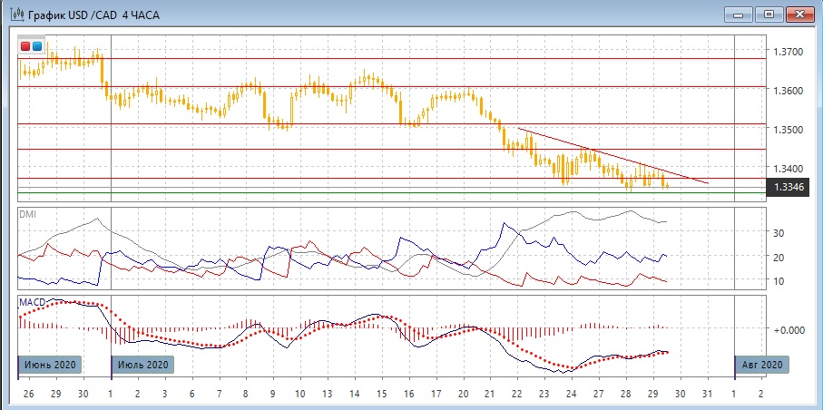 На четырёхчасовом графике образуется направленный вниз треугольник, с нижней границей на 1,3330 и верхней на краткосрочной линии тренда по максимумам с 22 июля. Так как это фигура продолжения, более вероятный выход из него - вниз. По ADX тенденция сильная и в этом масштабе: превышение DM- над DM+ значительное и устойчивое, ADX на высоком уровне. Однако здесь ранее образовалось бычье расхождение минимумов пары и гистограммы MACD, и при снижении в течение дня оно снова может образоваться, это может укрепить поддержу на 1,3330. Так как продолжается снижение, и ближайший "круглый" уровень 1,3400 выступает сопротивлением (и ранее потенциальное сильный уровень поддержки на 1,3370 становится сопротивлением), пока не видно признаков разворота, и скорее снижение будет продолжаться.