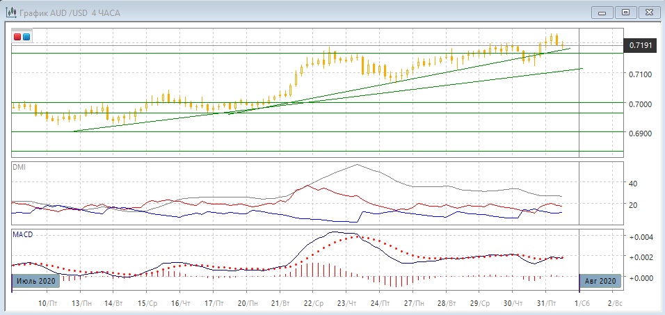 На четырёхчасовом графике дальнейшая перспектива, вероятно, будет зависеть от того, удержится ли пара выше уровне 0,7200 (максимумы 29 июля и близко к максимуму 22 июля), а также выше линии тренда и уровне поддержки на 0,7165, или преодоление зоны поддержки изменило бы, по крайней мере в краткосрочной ситуации, тенденцию роста, которая пока не нарушена. Пока пара выше 0,7165, более вероятным видится возобновления роста в этом масштабе.