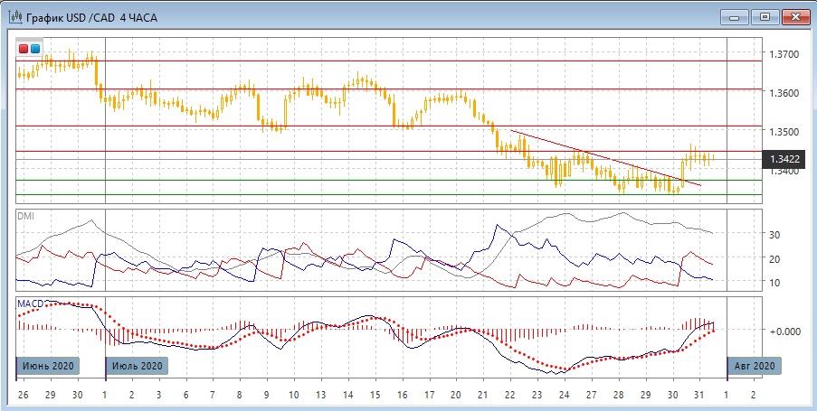 На четырёхчасовом графике после резкого роста с преодолением линии нисходящего тренда с 22 июля происходит консолидация: пара выше "круглого" уровня 1,3400, который является сейчас ближайшей поддержкой, но ниже уровня 1,3445 (поддержка 21-22, сопротивление 24 и 30 июля). Так как консолидацию сейчас можно расценивать как "флаг", вероятен выход из неё вверх (так как это фигура продолжения) более вероятен. По индикаторам направленного движения тенденцией стал рост: DМ+ существенно выше DM-, гистограмма MACD находится положительной зоне, линия MACD имеет положительный наклон.
