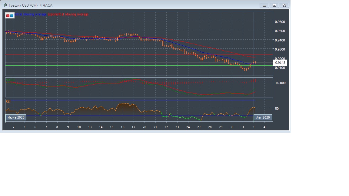 На четырёхчасовом графике скользящие средние с периодом 21 и 55 дней замедлились и перестали двигаться вниз, сохраняя расхождение. При этом график рынка развивается между экспоненциальных скользящих средних, что подтверждает смену тенденции данного рынка в краткосрочной перспективе.