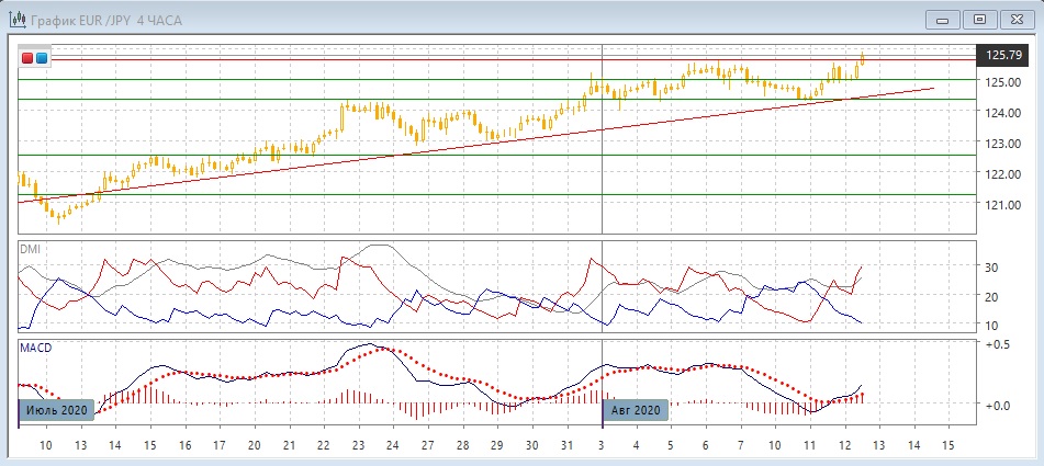 На дневном графике пара остаётся выше максимума июня и выше линии тренда с конца июня. Пара достигла уровня максимумов начала августа. Медвежье расхождение максимумов пары и гистограммы MACD сохраняется, это осложняет рост. По ADX тенденция роста сильная: превышение DM+ над DM- большое и устойчивое при высоком уровне ADX. Последовательность роста пары сохраняется, однако видимое замедление и величина волны роста (около 600 пунктов) без существенных откатов увеличивают вероятность разворота. Сейчас на разворот указало бы преодоление линии тренда и поддержки на 124,35.