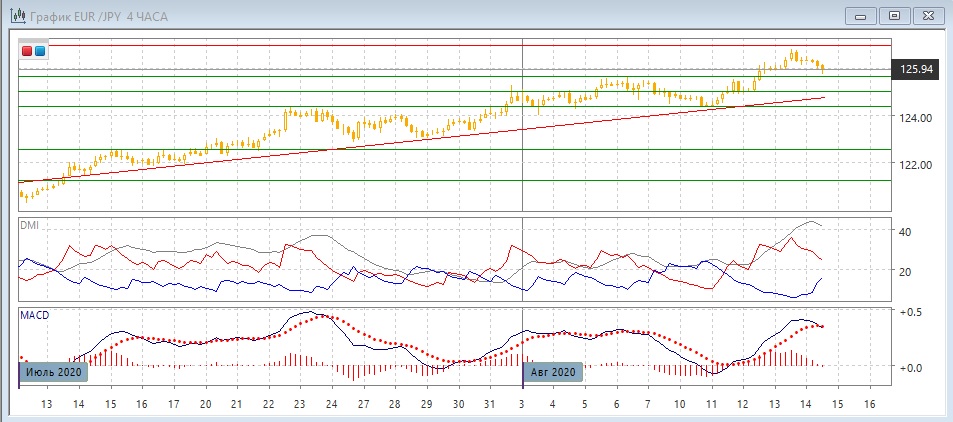 На четырёхчасовом графике пара почти достигла цели измеренного движения 127, равного ширине диапазона 124,35-125,65, после выхода из него вверх. 12 июля. При откате верхняя граница диапазона 125,65 может выступить поддержкой. При преодолении уровня 125,65 снижение может продолжиться до следующей сильной поддержки на 124,25. Сейчас снижение остаётся в пределах коррекционного, и тенденция роста не поменялась.