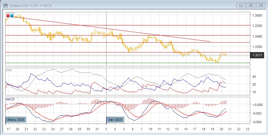На дневном графике пара достигла очередного более низкого минимума, вновь образовалось бычье расхождение минимумов пары и гистограммы MACD. Отскок вверх был ограничен на минимуме начала августа 1,3240. Если этот уровень будет преодолен, следующего сопротивления можно ожидать на линии нисходящего тренда (он примерно соответствует сейчас ключевому сопротивлению на 1,3330). Пока тенденция снижения пары сохраняется, и действовать против нёт рискованно. По ADX снижение является очень сильной тенденцией: превышение DM+ над DM- очень большое при высоком уровне ADX.