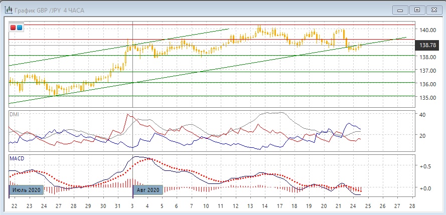 На четырёхчасовом графике пара вернулась с линии тренда снизу, и здесь может встретить усиление сопротивления, так как линия тренда примерно соответствует по уровню двух минимумам 18 и 20 августа. Преодоление линии тренда и этих двух минимумов сохраняет медвежью картину с 13 августа, когда относительные максимумы и минимумы пары стали снижаться. По индикаторам направленного движения снижение является слабой тенденцией: DM- заметно выше DM+, гистограмма MACD в отрицательной зоне, линия MACD имеет отрицательный наклон. Так как пара вернулась в диапазон 138-139,20, ближайшей целью видится нижняя его граница.