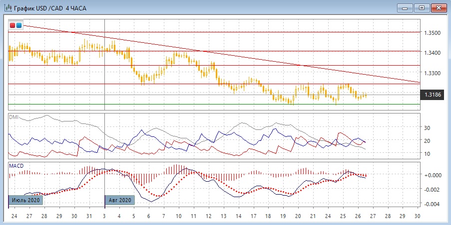 На четырёхчасовом графике пара находится в диапазоне 1,3140-1,3240, и она снижается от верхней границы после достижения её 24-25 августа. После приближения к нижней границе образовался относительный минимум, и сейчас пара, возможно, будет возвращаться к верхней границе диапазона. В целом пара стабилизировалась, и боковое движение пока может продолжаться. По индикаторам направленного движения в этом масштабе флэт: DM+ и DM- пересекаются при низком уровне ADX, гистограмма MACD колеблется около нуля.
