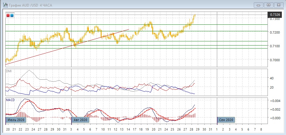 На четырёхчасовом графике преодоление уровня 0,7250 также довольно явное. Рост ускорился. По индикаторам направленного движения тенденция роста теперь хорошо выражена: превышение DM+ над DM- большое, ADX на высоком уровне, гисттгамма MACD растёт в положительной зоне, линия MACD имеет положительный наклон. Ближайшим уровнем поддержки при откате теперь является "круглый" уровень 0,7300, поддержка на верхней границе канала в августе 0,7250, вероятно, будет более сильной.