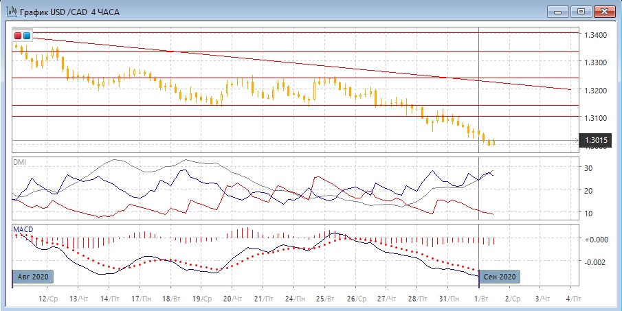 На дневном графике снижение продолжилось и пара достигла психологически важного уровня 1,30. Здесь может быть попытка отскока вверх, тем более что последовательность снижения увеличивается уже до шести сессий подряд. Пара остаётся ниже линии тренда, последовательность снижения относительных максимумов и минимумов не нарушена. По ADX тенденция снижения очень сильная: превышение DM- над DM+ очень большое при очень высоком уровне ADX. Идти против тенденции очень рискованно.