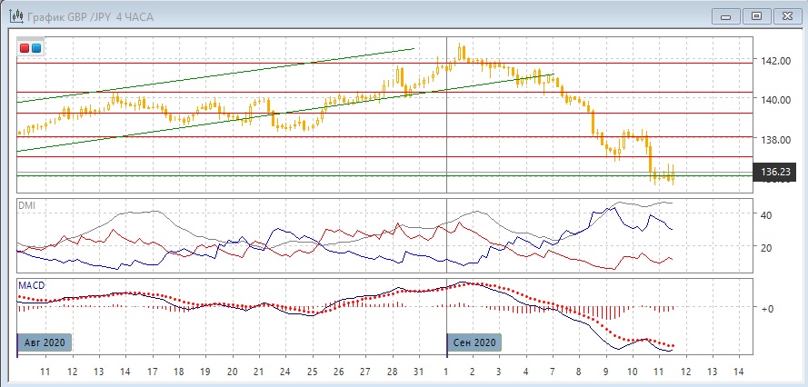На четырёхчасовом графике снижение замедляется. У уровня поддержки 136,00 пара находится второй день. При этом образовалось бычье расхождение минимумов пары и гистограммы MACD, что увеличивает вероятность отскока вверх. Однако отсутствие фактического отскока после достижения сильного уровня поддержки, скорее, не является бычьим признаком. И сигнал расхождения не подтверждается. По индикаторам направленного движения в этом масштабе тенденция снижения очень сильная: превышение DM- над DM+ очень большое при высоком уровне ADX, гистограмма MACD остаётся в отрицательной зоне, линия MACD имеет отрицательный наклон. Сигналом продолжения снижения сейчас было бы закрепления ниже 136,00.