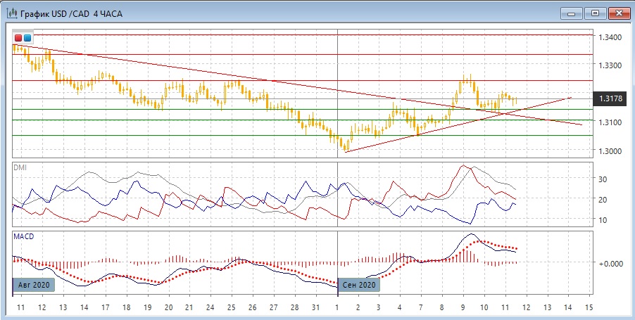 На четырёхчасовом графике пара остаётся выше линии тренда, если строить её по минимумам сентября. Кроме этого, важно, что пара осталась выше уровня поддержки 1,3140. Рост относительных минимумов пары продолжается. По индикаторам направленного движения тенденция роста сохраняется: DM+ выше DM-, коррекция видна по нахождению гистограммы MACD в отрицательной зоне и отрицательной наклоне линии MACD. Краткосрочной целью видится возвращение к сопротивлению на 1,3240 (у максимумов 9 сентября).