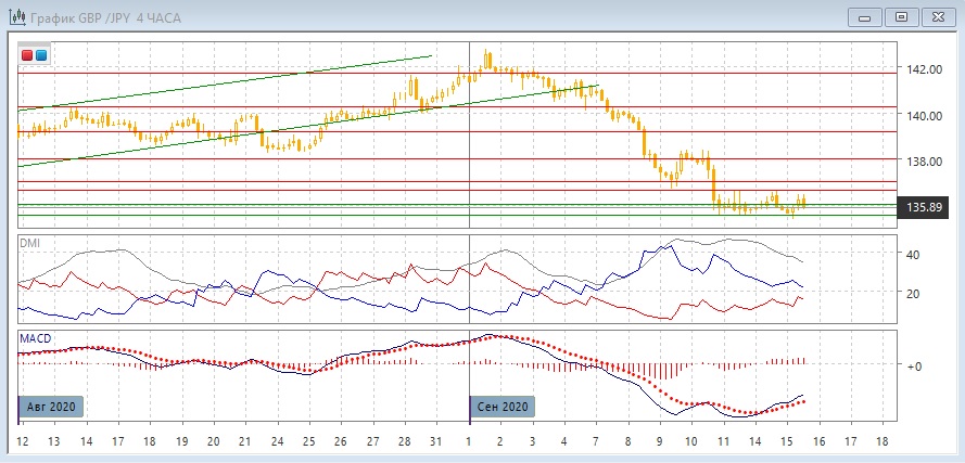 На дневном графике снижение приостановилось, и ниже важного уровня поддержки 136,00 оно не продолжается, несмотря на образование двух свечей с верхними тенями и закрытие ниже этого уровня в течение трёх дней. Закрытие выше 136,00 могло бы обозначить, что отскок может развиться. Однако, с другой стороны, после снижения на более 600 пунктов отскока фактически не было, и это может говорить о том, что тенденция снижения остаётся сильной, что превратило возможный отскок в остановку. По индикаторам направленного движения тенденция снижения усилилась: DM- значительно выше DM+, гистограмма MACD снижается в отрицательной зоне, линия MACD сохраняет отрицательный наклон.