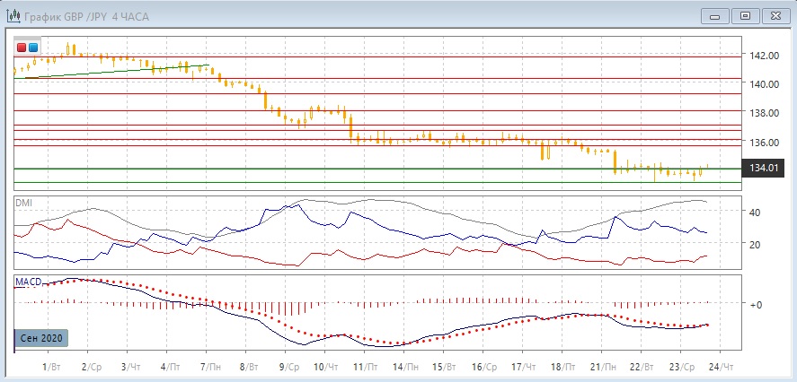 На четырёхчасовом графике пара стабилизировалась около 134,00. Около 133,00 может образоваться небольшое двойное дно. Восстановление пары выше 134,00 может показывать, что преодоление этого уровня было ложным пробоем поддержки. Для дальнейшей перспективы, вероятно, важно, где закрепится пара - если выше 134,00, то более вероятен дальнейший отскок вверх, если ниже - то снижение может продолжиться. В этом масштабе по ADX тенденция снижения также сильная, но образовалось бычье расхождение минимумов пары и гистограммы MACD, что укрепляет поддержку на 133,00.