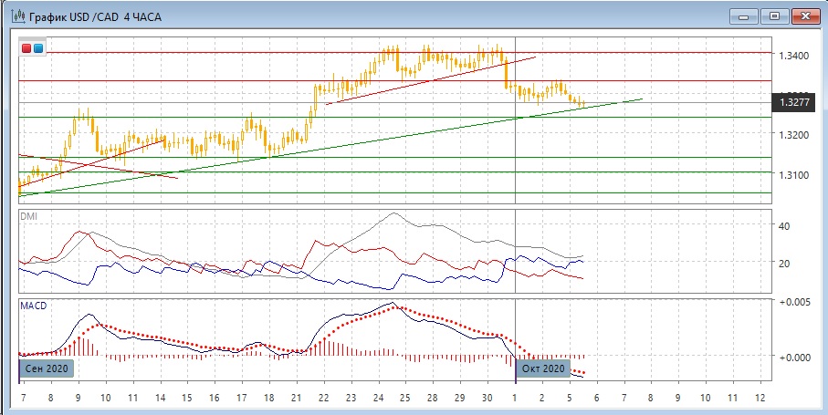 На четырёхчасовом графике сохраняется тенденция снижения, относительные минимумы и максимумы снижаются. Устойчивое превышение DM- над DM+ сохраняется. Учитывая, что размер диапазона в конце сентября около 90 пунктов, цель измеренного движения, равного размеру диапазона, после преодоления 1,3330 1,3240, что соответствует важному уровню поддержи.