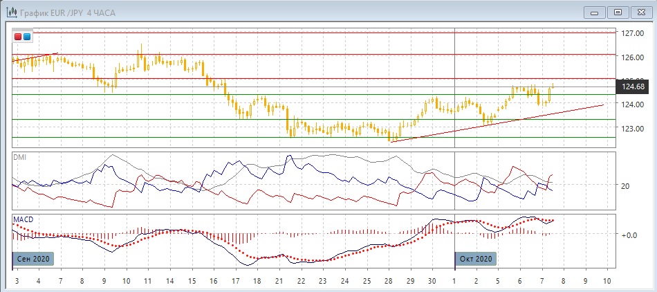 На дневном графике пара достигла нового максимума. Закрытие 5 октября было выше важного уровня 124,35, что открывает пространство для дальнейшего роста. При закрытии в среду выше это предположение укрепится. По индикаторам направленного движения возможен разворот: превышение DM- над DM+ уже минимальное, гистограмма MACD растёт в положительной зоне, линия MACD имеет положительный наклон.