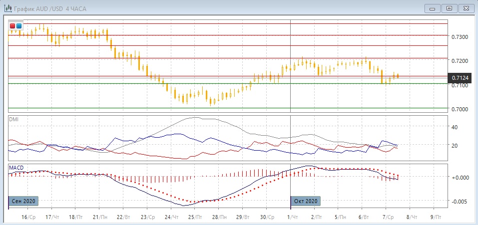 На четырёхчасовом графике у 0,7200 образовалась двойная вершина. Преодоление уровне 0,7130 подтверждает её, так как был преодолен промежуточный минимум двойной вершины. Кроме этого, 0,7130 важный уровень на дневном графике. Размер фигуры в 70 пунктов предполагает цель измеренного движения на 0,7040. Если предполагать завершение коррекции вверх к снижению от 0,7350, более отдалённой целью видится возвращение пары к психологически важному уровню 0,7000, где находились минимумы конца сентября, и откуда началась волна роста конца сентября - начала октября. По индикаторам направленного движения тенденцией стало снижение: DM- немного выше DM+, гистограмма MACD в отрицательной зоне, линия MACD имеет отрицательный наклон.
