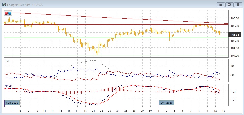 На дневном графике пара остаётся ниже линии нисходящего тренда, если строить её с конца июня. Также пара снизилась от сопротивления на 106,00. Более вероятным кажется, что пара снизится в ближайшей перспективе, но у зоны 105-105,20 можно ожидать сильной поддержи, как в августе и в начале октября. По ADX тенденция снижения сохраняется: DM- существенно выше DM+, ADX на высоком уровне.