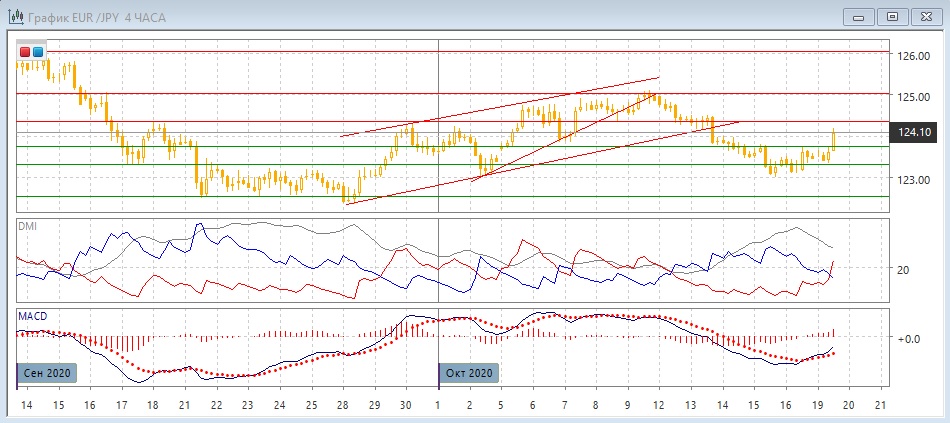 На четырёхчасовом графике тенденция изменилась: относительные максимумы и минимумы теперь растут, пара преодолела сопротивление на 123,75, около этого уровня были максимумы 14-16 октября. Пара приближается к более сильному сопротивлению на 124,35, дальнейшая краткосрочная перспектива, вероятно, будет зависеть от того, будет ли преодолён этот уровень: если да, откроется возможность для продолжения роста, если пара снизится ниже 123,75, более вероятным видится возобновление снижения. Уровень 134,35, вероятно, будет тестироваться. По индикаторам направленного движения тенденцией стал рост: DM+ теперь выше DM-, гистограмма MACD растёт в положительной зоне, линия MACD имеет положительный наклон.
