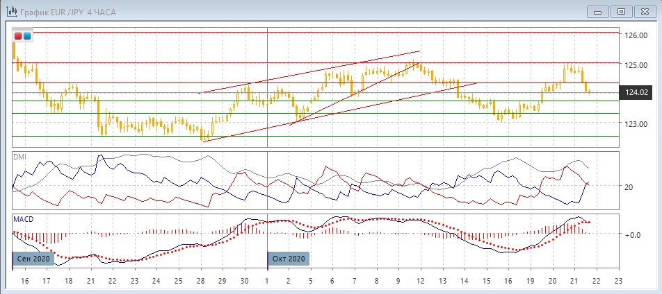 На четырёхчасовом графике пара перешла к снижению после остановки ниже 125,00, где образовался ряд близкий к "дожи" свечей. По индикаторам направленного движения тенденцией стало снижение: DM- теперь выше DM+, гистограмма MACD снизилась в отрицательную зону, линия MACD переходит к горизонтали. Образование двух больших максимумов у 125,00 может привести пару обратно к сильной поддержке на 123,30.