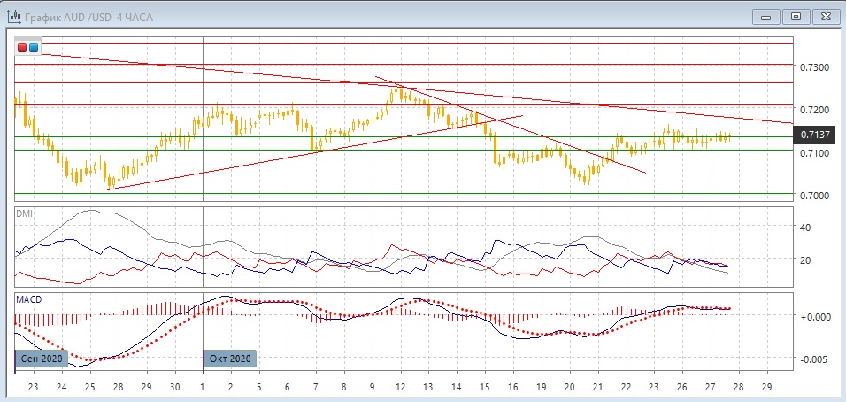 На четырёхчасовом графике пара находится в узком диапазоне выше 0,7100. Закрепление пары выше 0,7100 делает более вероятным выход из консолидации вверх. Ситуация скорее нейтральная, и стоит подождать развития. По индикаторам направленного движения флэт: DM+ и DM- близки, ADX на низком уровне, гистограмма MACD около нуля, линия MACD близка к горизонтали.