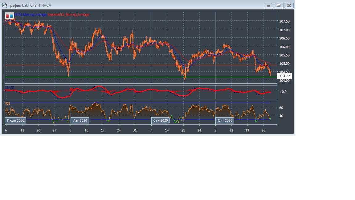 Скользящие средние с периодом 21 и 55 дней ускорились и продолжают движение вниз, интенсивно увеличивая расхождение, что свидетельствует в пользу медвежьего сценария этого рынка в краткосрочной перспективе. Четырёхчасовой график прогрессирует в области между экспоненциальных скользящих средних, что подтверждает медвежий потенциал данного рынка в краткосрочной перспективе.