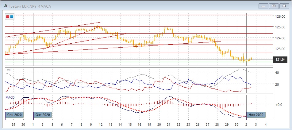 На четырёхчасовом графике пара стабилизировалась около 122. Отскока вверх не произошло, несмотря на образование бычьего расхождения минимумов пары и гистограммы MACD. Последовательность снижения относительных максимумов и минимумов сохраняется. Движение до появление результата выборов в США может приостановится, если на рынке будет преобладать выжидательное поведение. Пока продолжение снижения кажется более предпочтительным. Восстановление выше 122,55 изменило бы картину.