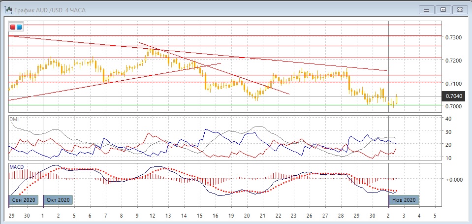 На четырёхчасовом графике образуется база на 0,7000. В этом масштабе также образовалось бычье расхождение минимумов пары и гистограммы MACD, что увеличивает вероятность разворота вверх. Важным фактором является приближением выборов в США, что потенциально ведёт сильному движению, не техническому по сути. До этого пара, возможно, будет продолжать находится в консолидации выше 0,7000.