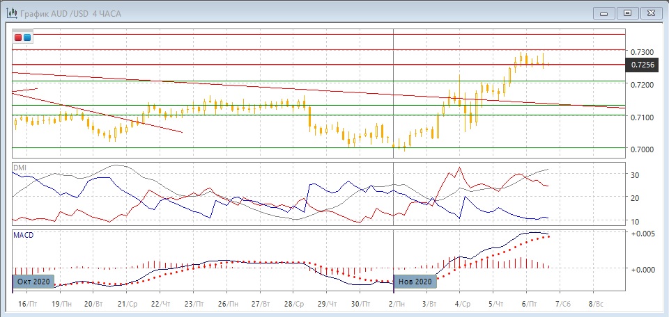 На четырёхчасовом графике после волны роста от нисходящего тренда пара консолидируется ниже 0,7300. Учитывая верхние тени последних свечей и то, что более высокий относительный максимум не был достигнут, может произойти откат при преодолении 0,7260. В более широкой перспективе тенденция роста сохраняется, и даже если откат будет, рост, вероятно, возобновится. По индикаторам направленного движения - коррекция к росту: DM+ значительно выше DM- при высоком уровне ADX, гистограмма MACD снижается, но остаётся в положительной зоне, линия MACD имеет положительный наклон.