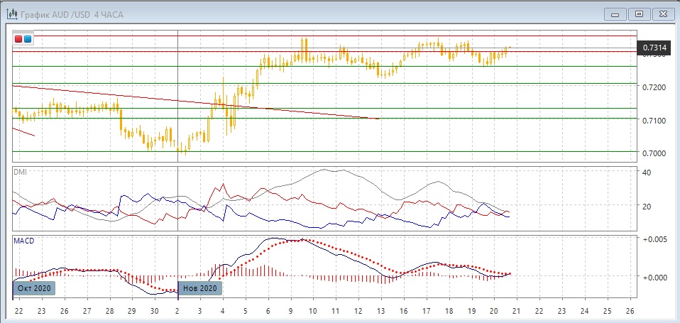 На четырёхчасовом графике в рамках движения в канале 0,7260-0,7350 более вероятно движение к верхней границе, так как пара выросла от нижней, и, кажется, преодолевает уровень 0,7300. По индикаторам направленного движения флэт: DM+ и DM- близки, ADX теперь на низком уровне, гистограмма MACD продолжает колебания около нуля.