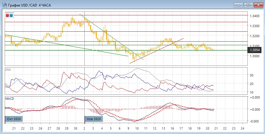 На четырёхчасовом графике можно выделить диапазон 1,3050-1,3140. В рамках движения в диапазоне более предпочтительным является рост к верхней границе, так как пара уже достигла нижней, и слабое движение не показывает достаточной динамики, что преодолеть уровень поддержки на 1,3050. По индикаторам направленного движения в этом масштабе также флэт: ADX на очень низком уровне, гистограмма MACD около нуля, линия MACD близка к горизонтали. Однако, если пара преодолеет уровень 1,3050, это может привести её к минимум ноября. Цель измеренного движения при выходе из диапазона была бы 1,2960.