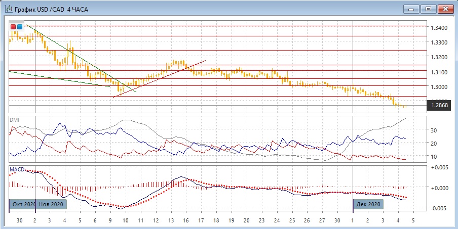 На четырёхчасовом графике была преодолена поддержка на 1,2930 - последняя из ближайших, у минимума ноября. Теперь снижение облегчается, несмотря на уже значительное движение с середины ноября. По ADX в этом масштабе тенденция очень сильная: превышение DM- над DM+ очень большое при высоком уровне ADX (и он продолжает расти). При отскоке сопротивления можно ожидать на ранее преодолённом уровне 1,2930.
