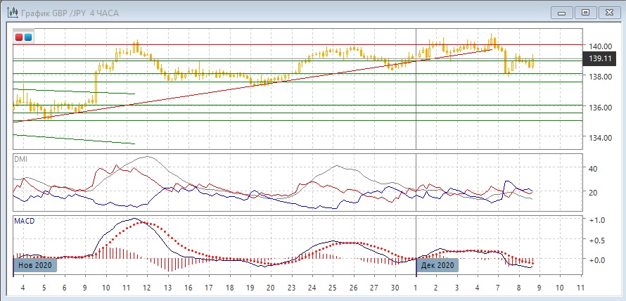 На дневном графике пара преодолела линию восходящего тренда с начала ноября и вернулась ниже сопротивления на 140,00 (это важный уровень сопротивления, проявлявшийся в августе и в ноябре). Снижение, однако, не было продолжено, образование больших нижних теней у свечей говорит, что рост может возобновиться. Сейчас положение рискованное, так как постоянно отодвигаемые крайние сроки соглашения по торговле после Brexit уже не могут больше отодвигаться, так как переходный период заканчивается в конце года. При заключении соглашения фунт может существенно вырасти (это более вероятный вариант), и при провале переговоров - существенно снизиться (это менее вероятный вариант). Если предположить повторение заключения соглашения "в последний момент", как это было с предыдущим соглашением, последствием может быть значительный рост пары.