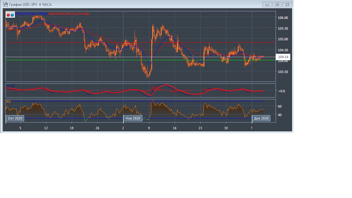 Скользящие средние с периодом 21 и 55 дней замедлились и сокращают расхождение до минимального, что может закончиться формированием сигнала на покупку и свидетельствует в пользу смены тренда и начала бычьего сценария этого рынка для краткосрочной перспективы, при условии если сигнал будет сформирован. Четырёхчасовой график прогрессирует между экспоненциальных скользящих средних, демонстрируя консолидацию рынка в краткосрочной перспективе.