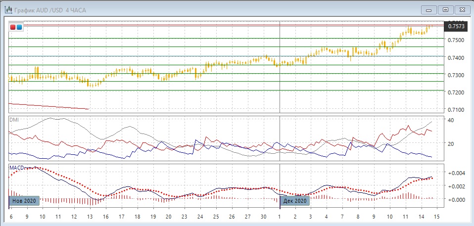 На четырёхчасовом графике на уровне 0,7580 пара может пока остановится, так как там возможно образование двойной вершины, после того, как рост после выхода пары из консолидации 0,7400-0,7455 вверх приостановился. У 0,7580 образовалось медвежье расхождение уровней пары и гистограммы MACD. Вместе с образованием расхождения на дневном графике это может быть более серьёзным сигналом, укрепляющим сопротивление на 0,7580. Однако разворота не было, и риск продолжения роста высокий, так как тенденция роста сильная. Последовательно роста относительных максимумов и минимумов пары сохраняется. По ADX тенденция роста очень сильная: превышение DM+ над DM- очень большое, ADX на высоком уровне и растёт.