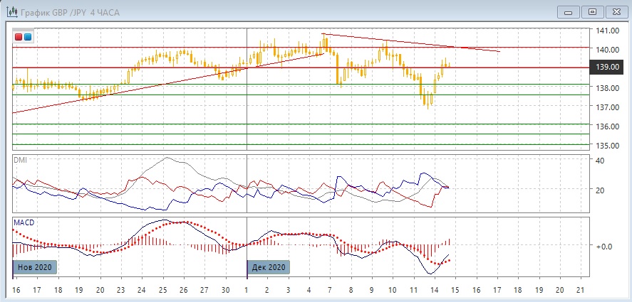На дневном графике пара осталась в диапазоне 137,55-140,00. Закрытие ниже уровня поддержки 137,55 в пятницу может быть ложным пробоем, так как пара быстро восстановилась выше сильного уровня поддержки 137,55. Исходя из движения в диапазоне, можно ожидать роста к верхней границе 140,00. Негативным может быть снижение относительных максимумов и минимумов пары с начала декабря. Так как пара преимущественно двигается за счёт стороны фунта, перспектива зависит сейчас не от технической картины, а от новостей, которые могут привести к резкому движению в любом направлении. С новостной точки зрения диапазон объясняется продолжением переговоров по торговле после Brexit без из успеха, но и без разрыва.