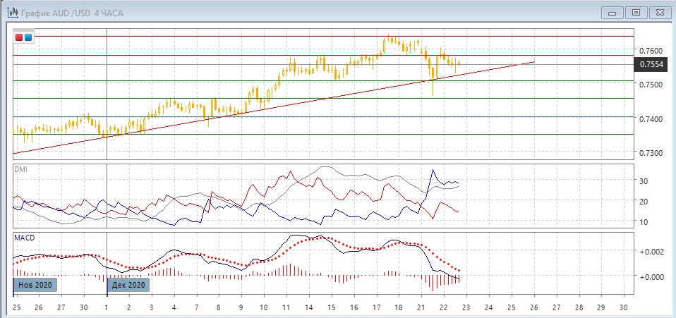 На четырёхчасовом графике пара вернулась в диапазон середины декабря 0,7500-0,7580. Пара перешла к снижению: относительные максимумы и минимумы теперь последовательно снижаются. По индикаторам направленного движения снижение также стало тенденцией: DM- значительно выше DM+, гистограмма MACD остаётся в отрицательной зоне, линия MACD имеет отрицательный наклон. Отскок вверх после приближения к уровню поддержки 0,7455, и который достиг "круглого" уровня 0,7600, можно теперь рассматривает как коррекцию к волне снижения от 0,7635. Краткосрочно более вероятным видится новое тестирование линии восходящего тренда.