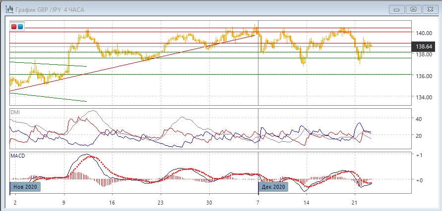 На четырёхчасовом графике пара также остаётся в диапазоне 137,55 - 140,00. Нижняя граница тестировалась в понедельник, и в рамках движения в диапазоне более вероятно движение к верхней границе на 140,00. Дополнительным подтверждением волны роста является поддержка при откате на уровне 138,10. По индикаторам направленного движения флэт: DM+ и DM- близки, ADX на низком уровне. Гистограмма MACD продолжает колебания около нуля.