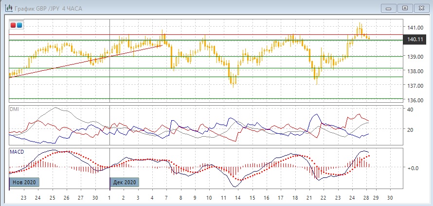 На четырёхчасовом графике похоже, что образуется ложный пробой: пара снизилась ниже уровня 140,40 и остаётся ниже этого уровня, а в начале понедельника уровень 140,40 уже выступил сопротивлением для пары. Пара остаётся выше другого важного уровня поддержки 140,00, преодоление этого уровня станет более сильным сигналом для дальнейшего снижения, так как ближайшая значимая поддержка будет только на 139,00. По индикаторам направленного движения - коррекция к росту: превышение DM+ над DM- остаётся высоким, ADX на относительно высоком уровне. Гистограмма MACD снижается, но остаётся в положительной зоне, линия MACD сохраняет положительный наклон. В краткосрочной перспективе, вероятно, лучше действовать в сторону выхода либо выше 140,40, либо ниже 140,00.