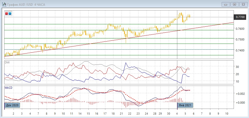 На четырёхчасовом графике резкое снижение 4 января также может быть предупреждающим сигналом. так как оно было резким и относительно большим по величине. Это показывает, что паре стало легче снижаться. Пара получила поддержку на максимумах 17-18 и 28 декабря, отскок вверх привёл пару выше "круглого" уровня 0,7700. При возвращении ниже, отскок вверх от 0,7635 будет выглядеть коррекцией к волне снижения, и возвращение к 0,7635 будет выглядеть более предпочтительным в краткосрочной перспективе.