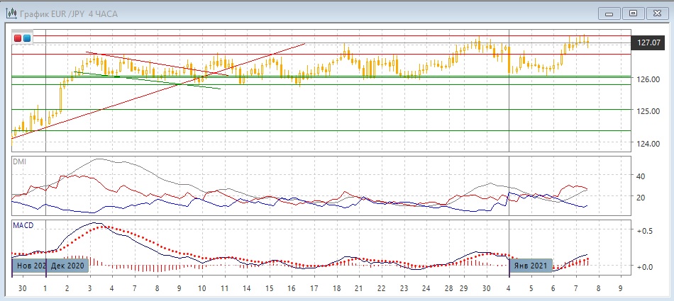 На дневном графике закрытие в 6 января было выше верх границы диапазона декабря 125,75-126,70. Кроме того, свеча роста была значительно больше предыдущих в диапазоне. Это может предполагает продолжение роста в краткосрочной перспективе. Однако пока на дневном графике образуется "падающая звезда", и это может привести к снижению, похожему на предыдущие два в декабре. Для продолжения роста необходимо закрепление выше 126,70. По индикаторам направленного движения коррекция к росту: превышение DM+ над DM- остаётся большим при высоком уровне ADX, коррекция видна по гистограмме MACD в отрицательной зоне и небольшому отрицательному наклону линии MACD. Кроме этого, образовалось медвежье расхождение максимумов пары и гистограммы MACD, что затрудняет рост.